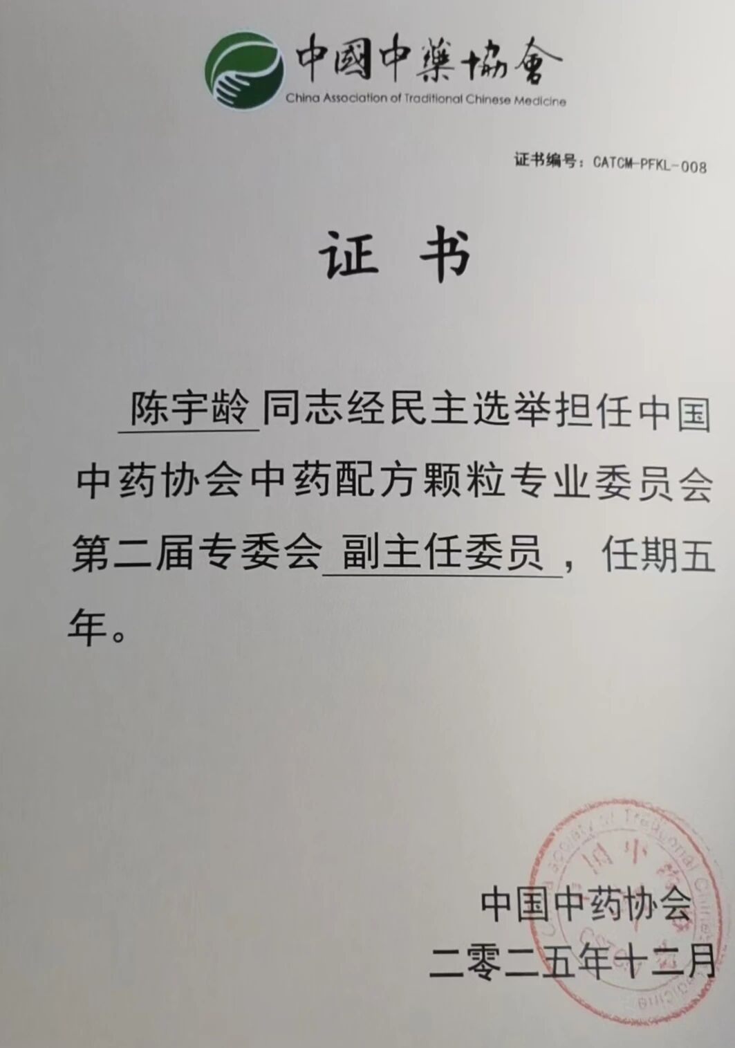 同時,在12月26日舉行的“中國中藥協會中藥配方顆粒專業委員會換屆大會”上,集團董事會主席兼行政總裁陳宇齡先生獲任中國中藥協會中藥配方顆粒專業委員會第二屆專委會副主任委員。