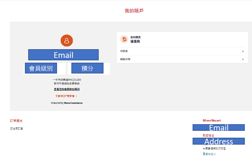 1. 登入後,按右上方「我的帳戶」可看到自己的會員級別﹑積分及優惠碼